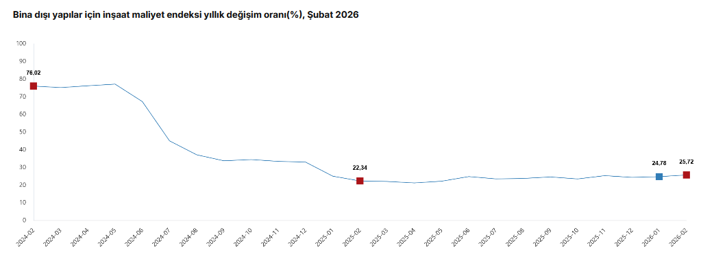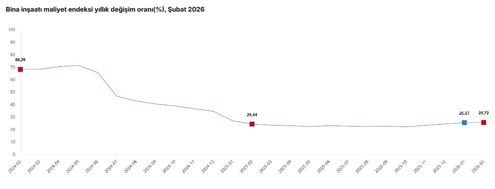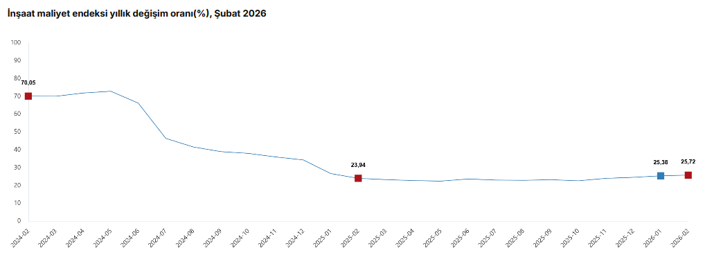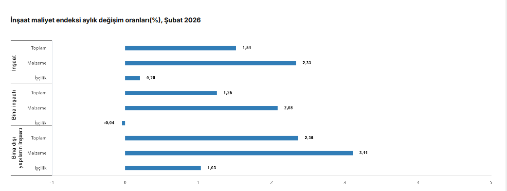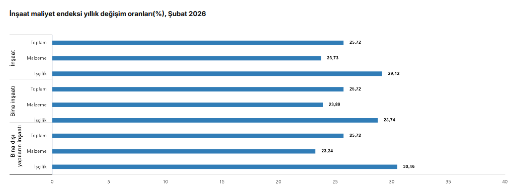 Türkiye İstatistik Kurumu (TÜİK) verilerine göre, inşaat maliyet endeksi, 2026 yılı Şubat ayında bir önceki aya göre yüzde 1,51 arttı, bir önceki yılın aynı ayına göre yüzde 25,72 arttı. Bir önceki aya göre malzeme endeksi yüzde 2,33 arttı, işçilik endeksi yüzde 0,20 arttı. Ayrıca bir önceki yılın aynı ayına göre malzeme endeksi yüzde 23,73 arttı, işçilik endeksi yüzde 29,12 arttı.